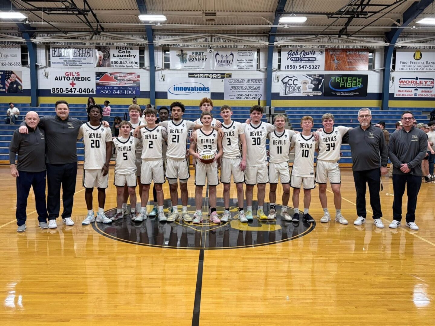 Clyde Roche (center) is surrounded by teammates and coaches of the Holmes County High School Blue Devils basketball team after surpassing the 1,000-career-point milestone during the Devils’ Jan. 30 matchup against Vernon, a moment the squad paused to celebrate together at midcourt.